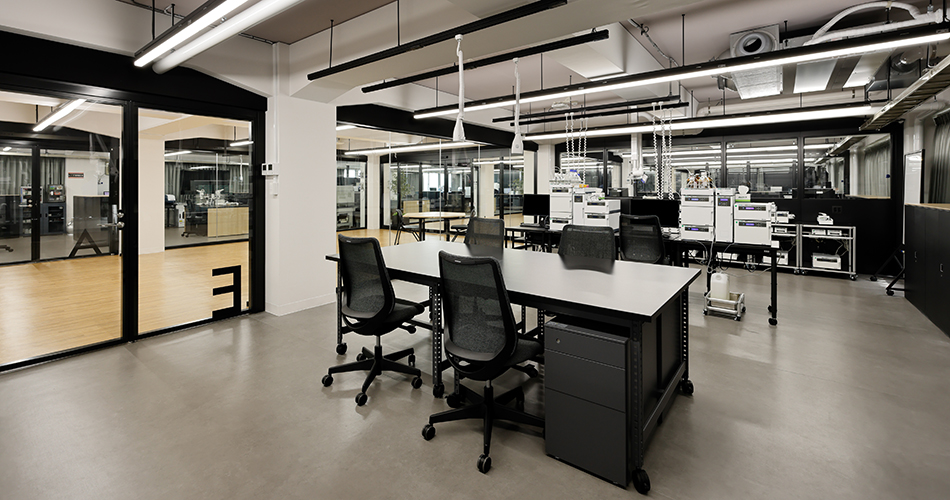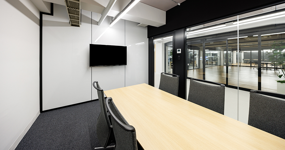 ラボスペースと同様にガラスパーティションで仕切られた会議室は、開放感を演出するだけでなく、空間全体に洗練された印象とスタイリッシュな雰囲気をもたらします