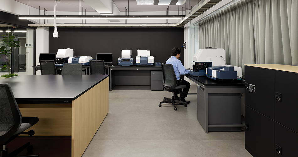 「対話を通じて、最適なソリューションをご提案する」をテーマに、ショールーム運用も含めたラボスペース「JASCO Solution Lab」をデザインしました。ガラスパーティションメインの開放的な空間づくりや、オープンな打合せスペースの採用は、従来の仕切られたラボエリアに慣れている方々にとって挑戦となりましたが、研究施設として見せる見せないのバランスを意識したことで、研究/製造/販売の全部門が納得のいく空間となりました。また、分析機器が空間の主役になるよう、什器・内装はブラックと落ち着いた木目を基調にデザインしています。