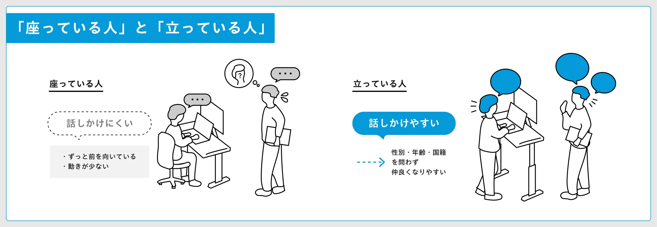 こうすることで立って仕事をしている人には気軽に話しかけても大丈夫だよ、という隙が生まれ、コミュニケーションが活性化します。また適度にスタンディングで仕事をすることで心身ともにリフレッシュすることができるため、健康にも良いと言われています。